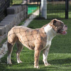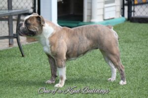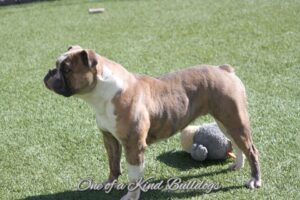 Charlie girl is one of my favorite Olde English Bulldogges here. She is off our customers dog Angus that we got to evaluate at 2 years old and use once before neutering. He is a frequent boarder here and his looks, temperament and conformation made it impossible to not have him make a generation for our program. He is off our Cappy and Cleo breeding. Charlie is very well rounded. She is athletic, playful, sweet and friendly. She is a great example of the Old English Bulldog breed. We are excited to have Charlie in our program.