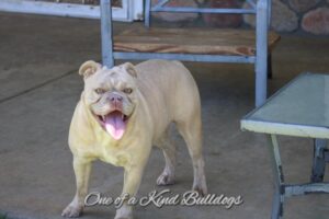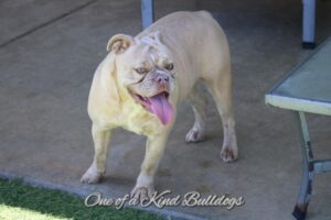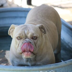Raven is a beautiful chocolate brindle Old English Bulldogge off of our One of a Kind’s Charilie girl and One of a Kind’s Macho Man aka Savage. Both parents generations of our work bred for conformation, health and temperament. Raven is amazingly sweet, on the smaller side at about 50 to 55 lb. She has great open nares and is a very clean breather. Raven is extremely athletic and functional which is exactly what we strive for with our Olde English Bulldogs. It took her a few days after having a litter to adjust, but she turned into a great mother.